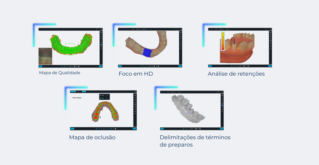 Mapa de calidad, mapa de oclusión, delimitación de la finalización de la preparación, enfoque en HD, análisis de retención.Herramienta de comparación de pruebas (antes y después):
